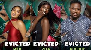 The Big Brother Naija Season 10 live eviction show yesterday delivered another twist in the competition as three housemates Mide, Zita, and Rooboy were evicted in the 9th week of the show.