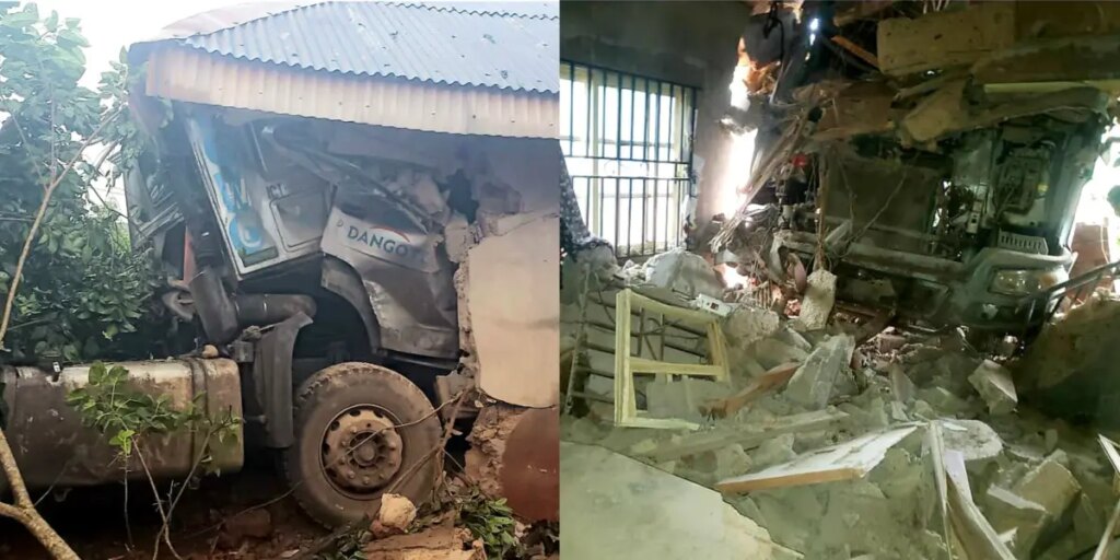 A fully-loaded Dangote Cement truck with registration number DGW109XA rammed into a house in Imasayi Yewa North local government area of Ogun state.