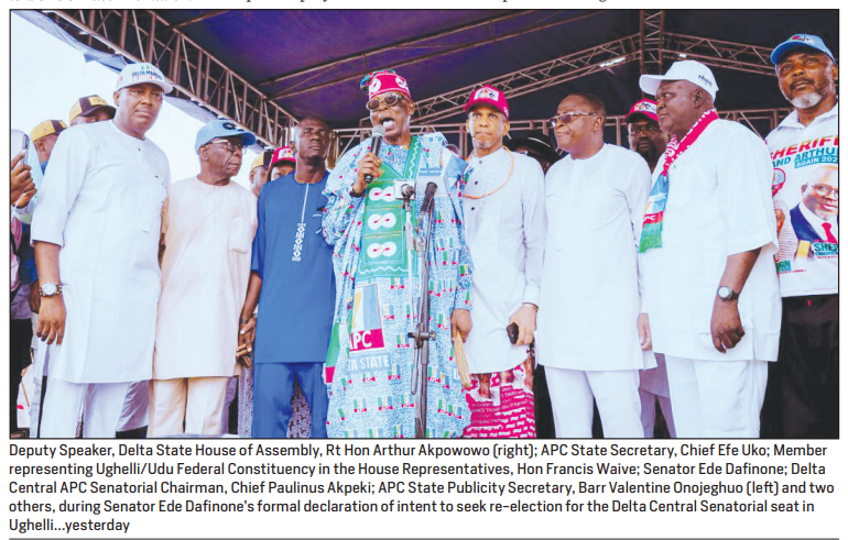 The All Progressives Congress (APC) in Delta Central Senatorial District, yesterday, witnessed a massive political gathering as Senator Ede Dafinone formally declared his intention to seek re-election in 2027, drawing widespread support from party leaders, stakeholders, and supporters.