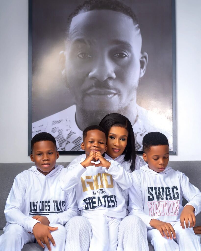 She also shared photos of herself and her three sons sitting in front of a large portrait of the late Junior Pope. They wore white clothes with inscriptions such as “Envy of every woman,” “Who does that?”, “God over everything,” and “Swag Nation.”